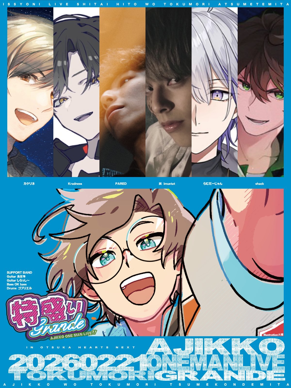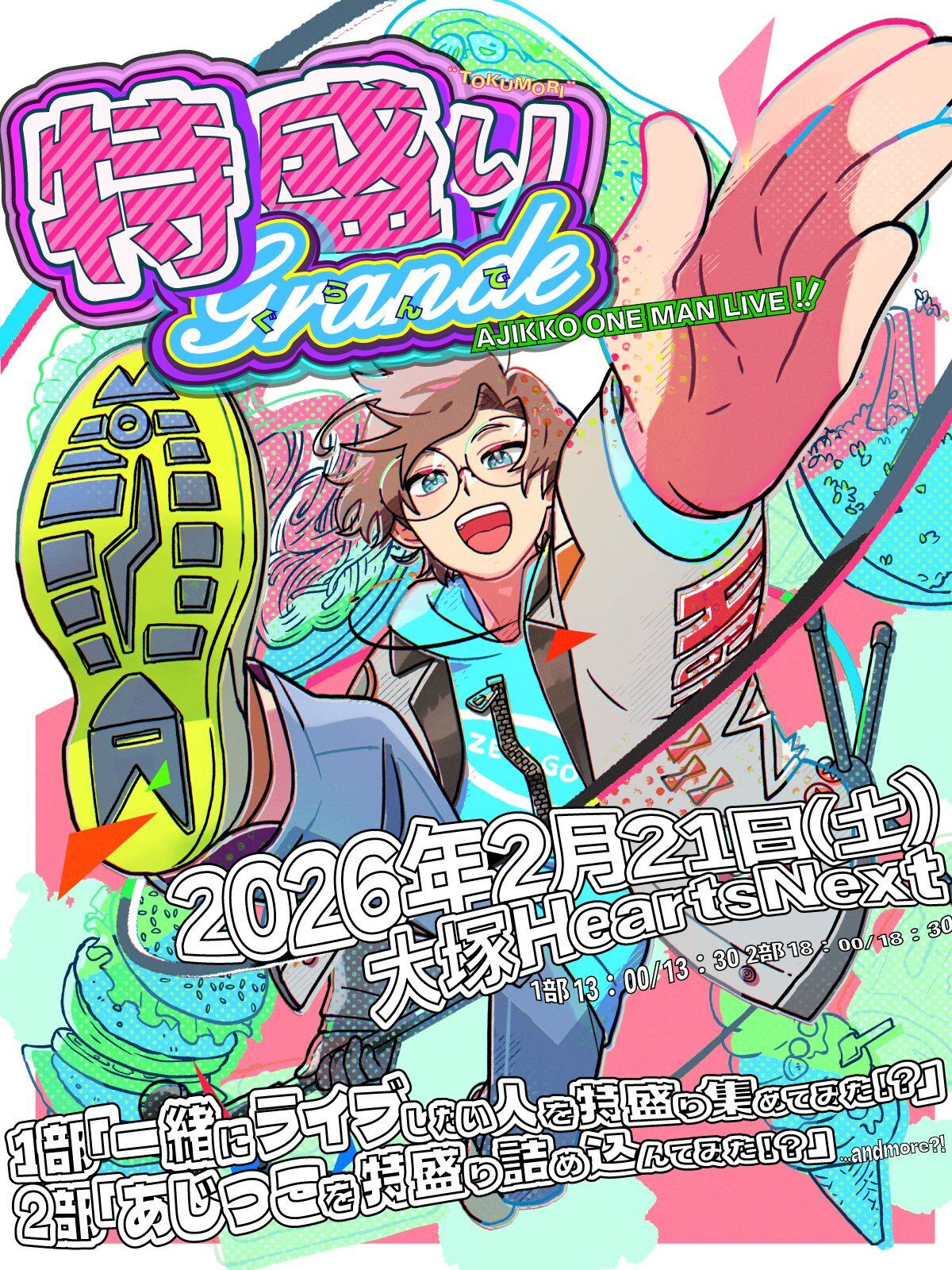 あじっこワンマンLIVE 『 特盛りグランデ 』 SCHEDULE 2026/02/21(土) 13:00 - あじっこワンマンLIVE 『 特盛りグランデ 』に出演致します! 2026.02.21(土) 1部-OPEN 13:00/START 13:30 2部-OPEN 18:00/START 18:30 @大塚Hearts Next 1部ゲスト: カケリネ/Kradness/shack/巽imustat/PARED/らむだーじゃん 2部○○:and more?! URLをコピーする 報告する